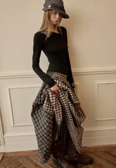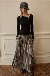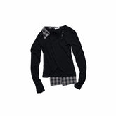 Designed with a layered illusion, the neckline and hem are spliced with plaid shirt fabric to create a stacked styling effect. The contrast between the soft knit body and structured plaid details adds depth and visual interest, giving the piece a refined layered look without added bulk.