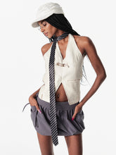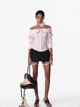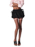 This tulip-style mini skirt features a layered hem and pleated structure that adds volume and movement. Designed with metallic pinstripes, a drawstring waist, and a decorative bow at the front. The soft yet structured fabric gives a vintage elegance, and the multiple folds enhance the silhouette. Available in grey and black.
