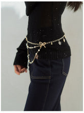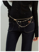 This statement waist chain features a layered design that blends delicate elegance with a modern decorative style. The slim chain base is accented with small bow details and cascading pearl strands, creating graceful movement and a refined layered look.