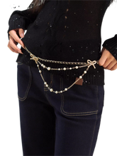 Multiple chains drape softly along the waistline, combining metallic shine with pearl accents to enhance visual depth. The design balances playful charm with subtle sophistication, making it an eye-catching accessory for both casual and styled outfits.
