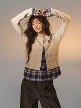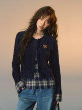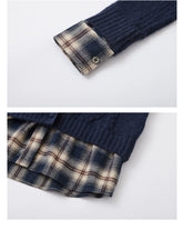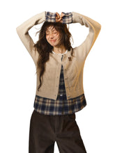 A stylish faux two-piece cardigan combining plaid tailoring with intricate cable knit texture for a modern preppy twist. This piece features a refined contrast between structured woven fabric and soft knit detailing, creating a visually layered effect without the bulk. Perfect for transitioning seasons, it blends comfort and sophistication in an effortlessly chic silhouette.