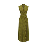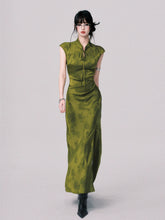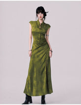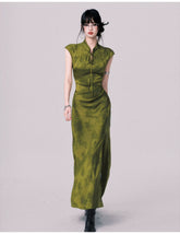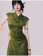 An original LULUSWINGS design in a refined moss green tone, inspired by modern New Chinese aesthetics. This jacquard cheongsam dress features a clean, structured silhouette with subtle vintage charm. Designed with a fitted waist and an elegant side slit, it elongates the figure while allowing graceful movement. The minimalist cap-sleeve cut and sculpted shoulder line balance tradition with contemporary femininity, making it ideal for summer events, cultural-inspired styling, or elevated daily wear with a sophisticated edge.