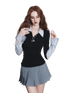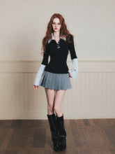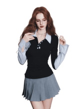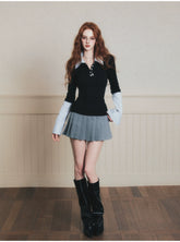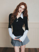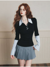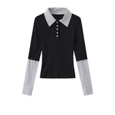 A chic “fashion nerd”–inspired knit top with a trendy Miu-style aesthetic, designed as a faux two-piece look. This long-sleeve polo knit features a crisp contrast shirt sleeve detail, blending classic preppy elements with modern styling. The slim yet comfortable fit creates a polished silhouette, while the layered design adds visual depth and effortless sophistication—perfect for elevated daily wear, campus-inspired outfits, or smart casual looks with a fashionable twist.