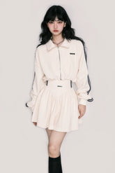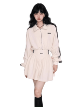 A retro American casual two-piece set inspired by a “genius girl” aesthetic, blending sporty charm with relaxed everyday style. The waffle-textured sweatshirt features an oversized silhouette with dropped shoulders for an effortless, laid-back look, while the matching mini skirt balances the outfit with a clean, youthful proportion. Designed for easy mix-and-match styling, this set delivers comfort, versatility, and a cool collegiate vibe perfect for daily wear or casual outings.