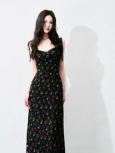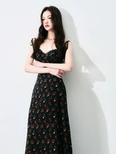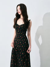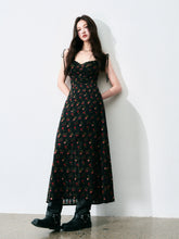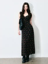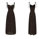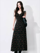 A romantic French-style vintage floral dress in classic black tones, designed with a delicate all-over ditsy floral pattern. Featuring a feminine tie detail and a defined waist, this A-line maxi silhouette elongates the figure while creating a soft, elegant drape. The dress offers a graceful balance of structure and flow, perfect for dates, evening outings, or refined daily wear, delivering a look that is both gentle and striking.