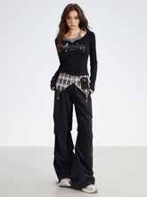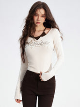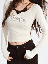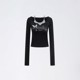 A chic two-in-one long sleeve tee that creates a stylish layered look in just one piece. The front features a delicate butterfly and letter print adorned with rhinestone embellishments, adding a subtle sparkle and youthful charm. Designed with a cinched waist to accentuate the figure, this cropped silhouette visually elongates the body proportions — perfect for a cute yet confident everyday style.