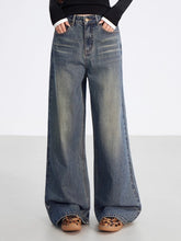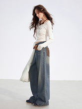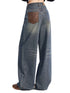 A timeless pair of wide-leg jeans with a vintage-inspired hue, perfect for autumn and winter. Designed with understated sophistication, the back pocket features a faux leather patch and delicate embroidery for a touch of refinement. The relaxed, flattering silhouette elongates the legs, making it an effortless wardrobe staple that pairs seamlessly with any top — versatile for all four seasons.
