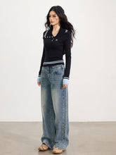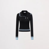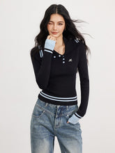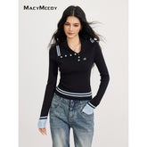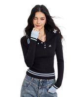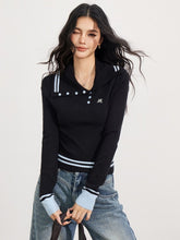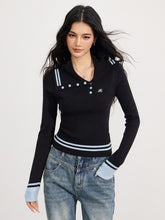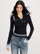A modern knit top featuring an asymmetric button design that adds a touch of individuality and sophistication. The clean silhouette is elevated with refreshing blue contrast panels, creating a balanced blend of calm elegance and youthful vitality. Crafted with a soft and stretchy knit fabric, it offers a slim, figure-flattering fit — perfect as a statement piece or a stylish layering essential for autumn and winter.