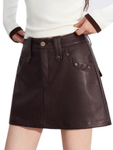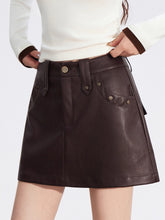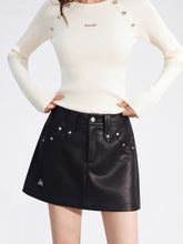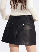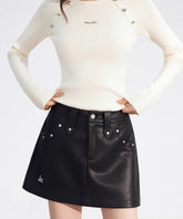 A chic and versatile A-line mini skirt designed to elevate your autumn and winter wardrobe. Crafted from soft and comfortable faux leather, this skirt features a waist-cinching silhouette that flatters the figure and creates a slimming effect. The stylish stud embellishments add a refined touch of attitude, making it perfect for pairing with any top for an instantly elevated look.