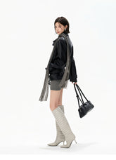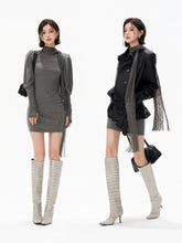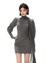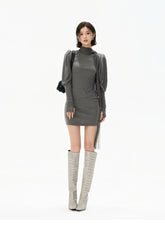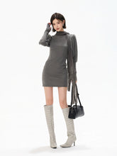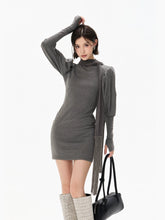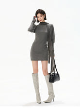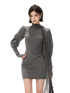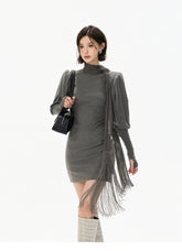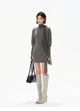 This refined knit mini dress embodies a cool, understated aesthetic, crafted from a soft and stretchy blended fabric that contours the body while ensuring comfort. The design features a draped turtleneck that adds depth and elegance, paired with elongated sleeves finished with thumbhole cuffs for a modern, functional touch. A subtle gathered detail at the waist creates a layered mini-skirt effect, enhancing the silhouette and naturally defining the waistline. Flowing tassel ties introduce movement and a sense of effortless sophistication. The combination of structured knit and fluid elements creates a balanced look that is both minimal and fashion-forward, ideal for layering or standalone styling.