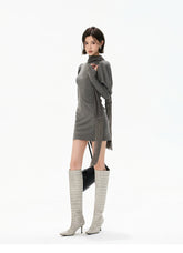 Minimalist Draped Turtleneck Knit Mini Dress with Tassel Ties