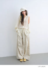This romantic knit two-piece set blends softness, texture, and effortless elegance. Crafted from a wool and mohair blend yarn, the set features a lightweight openwork knit structure that creates a delicate and airy appearance while maintaining warmth and comfort. The inner cami is designed with a slim silhouette and adjustable drawstring detail, adding a subtle feminine touch while enhancing the fit. Paired with a relaxed batwing-style knit cardigan, the set offers graceful layering and a soft drape that naturally flatters the body. The openwork knit pattern adds visual depth and a romantic feel, making this set perfect for spring layering, casual outings, or refined everyday styling.