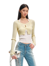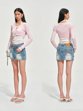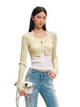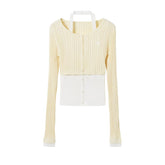 This refined knit cardigan features a faux two-piece design with a built-in halter-neck inner layer, creating a graceful ballet-inspired silhouette with a modern edge. The slim, body-hugging cut defines the waist and enhances natural curves, while the clean shoulder line and elongated sleeves add elegance and balance. Crafted from a breathable Tencel–linen blend with subtle stretch, it offers a lightweight, skin-friendly feel ideal for spring layering. Perfect as an inner layer or worn on its own, it pairs effortlessly with denim, tailored trousers, or skirts for a polished, feminine look.