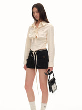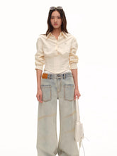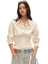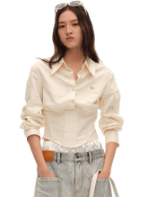 A modern cropped shirt crafted from a soft lyocell-cotton blend with a sand-washed finish for a smooth, breathable feel. The design features a center-back opening placket and a versatile off-shoulder construction that allows for multiple styling options. Tailored shoulders combined with a subtly cinched waist create a structured yet feminine silhouette. The lightweight fabric and contemporary cut make it an ideal piece for both casual and elevated everyday styling.