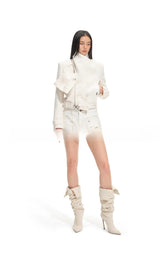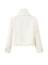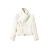 The bonded inner lining enhances structure and drape, allowing the coat to maintain a refined silhouette that is resistant to wrinkling and easy to style. Designed with a scarf-like shawl detail and precise shoulder shaping, this short fitted coat highlights elegance while offering both comfort and practicality.