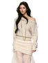 The shoulder area is crafted with bold cable-knit textures, adding depth and a classic knitwear aesthetic. Around the waist, varying cable patterns enhance the natural curves of the body while enriching the garment’s overall texture. A delicate knitted strap detail is integrated into the design, adding a refined accent that subtly elevates the sweater’s sophistication.