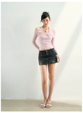 This fitted knit top features a halter-neck design combined with an off-shoulder neckline, highlighting the collarbone and shoulder line to create a sleek and feminine silhouette. The layered neckline structure adds visual depth while enhancing the elegant shape of the upper body.