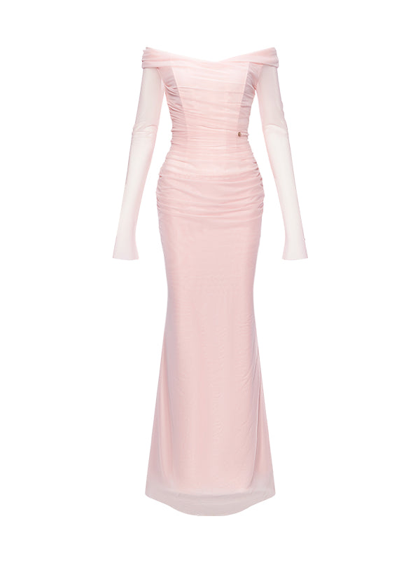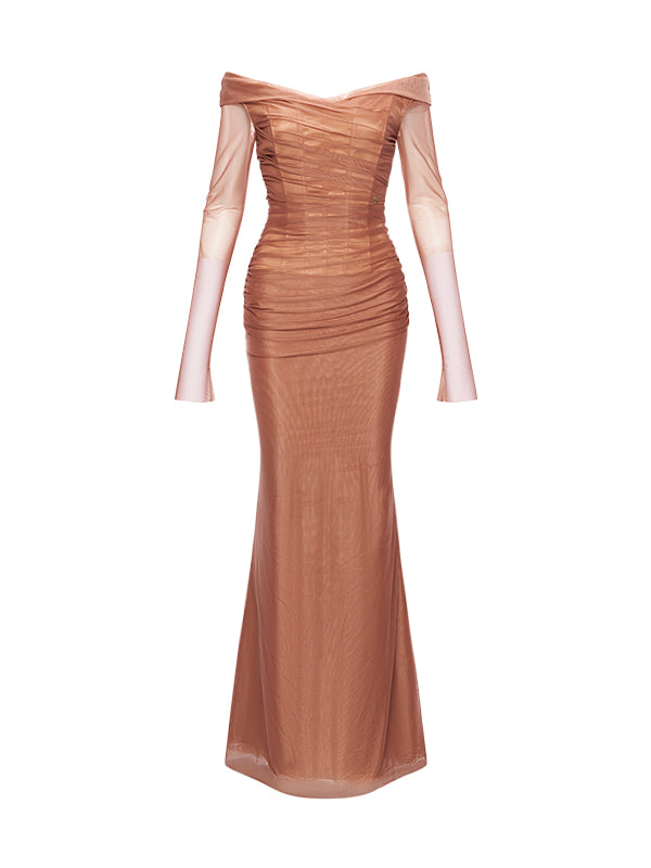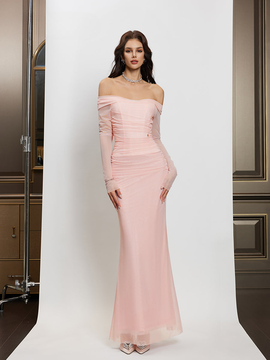 This elegant off-shoulder gown features a mesh corset design that accentuates the waist and flows down into a beautiful silhouette. Made of a soft polyester-spandex blend, it offers comfort and style for formal occasions. Available in sizes XS to L, this gown is tailored for a flattering fit.