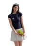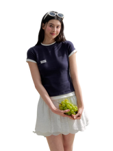 The design features a contrast color construction, where the main body pairs with contrasting collar, sleeve cuffs, and hem details to create a clean layered visual effect. The tailored slim silhouette refines the neckline, arms, and waist proportions, enhancing the natural body curve while delivering a neat and flattering look. A delicate embroidered logo at the chest adds a subtle highlight, combining understated branding with refined craftsmanship. The result is a versatile tee that effortlessly blends collegiate inspiration with relaxed everyday style.