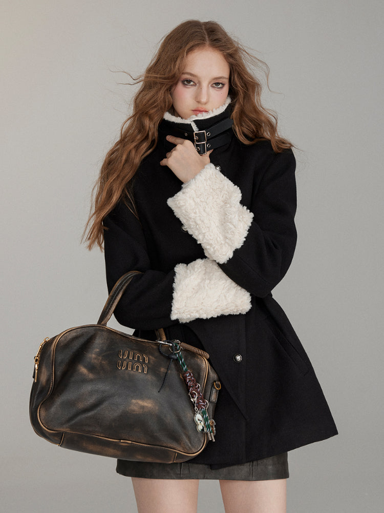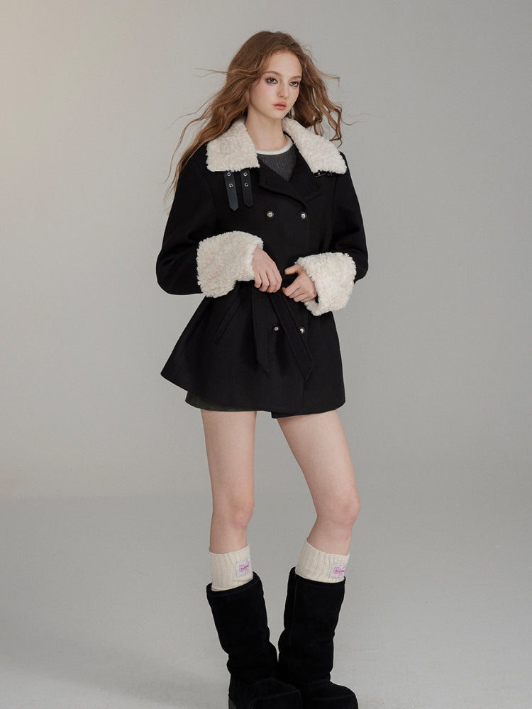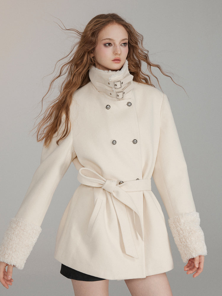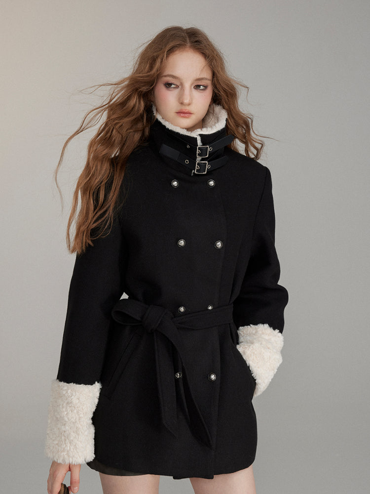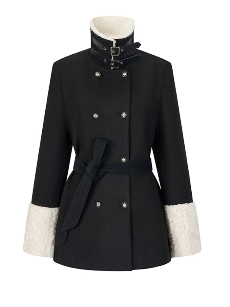 The coat features a dense and soft woolen texture, smooth and flat surface, and snug structure for enhanced insulation. Contrasting materials at the cuffs and collar add warmth, while the included belt accentuates the silhouette for a stylish look.