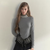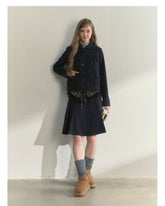 This set blends vintage girlish charm with a touch of Korean-inspired fashion. Every detail radiates sweetness and individuality. The denim fabric is accented with colorful speckles, reminiscent of sugar sprinkles, creating a bright and lively look. The jacket is lined with plaid cotton for added warmth and layered texture. The doll collar design adds a cute and refined touch, effectively softening the overall silhouette while giving it a polished edge. The flap pockets with bow embellishments enhance the structured form, while the floral-shaped buttons on the placket lend a subtle retro vibe. The shoulder line adds shape and presence, making the ensemble more structured and flattering.