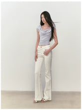 These denim long pants incorporate rhinestone and distressed elements, highlighting a vintage style with light and dark white - veined textures.