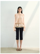 This airy blouse features a halter-inspired neckline with a soft draped collar that highlights the shoulder line and collarbone, creating an elegant and feminine silhouette. The flowing structure brings a graceful sense of movement while maintaining a refined design.