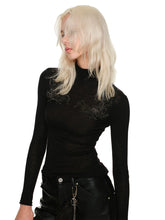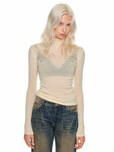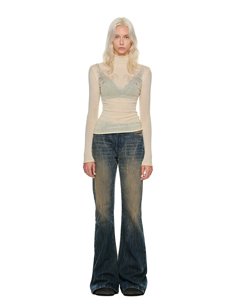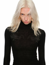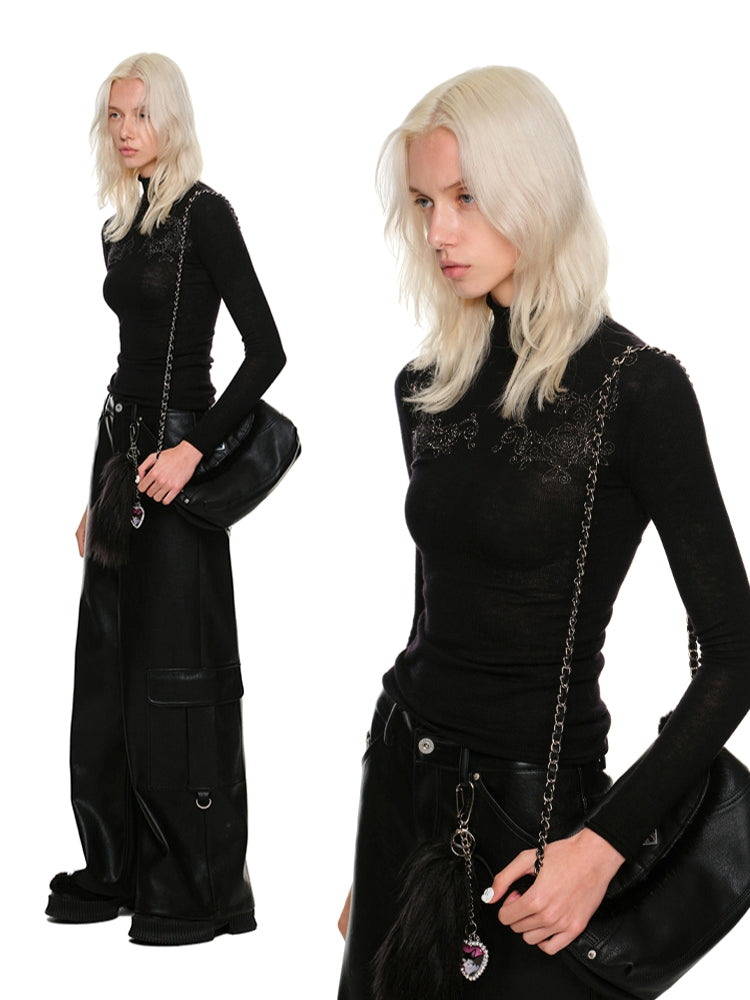 A beautiful turtleneck base layer adorned with delicate rhinestones arranged in a rose pattern. This knit garment is made of soft, stretchy fabric, perfect for layering or wearing alone in cool weather.