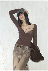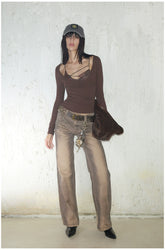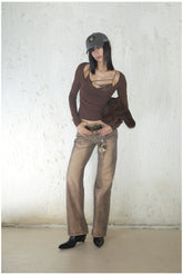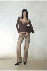 This vintage-inspired slim-fit top set features a slightly pleated silhouette that shapes the waist and enhances feminine curves. The front lapel design creates a stylish visual effect, adding sophistication to the overall look. The irregular strap camisole showcases a mix of polka dot and leopard print patterns, paired with a lightweight mesh fabric for a sheer yet elegant appeal. When layered together, the two-piece design exudes sexiness and depth without being overly revealing, highlighting a refined and confident feminine charm.
