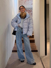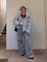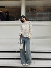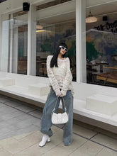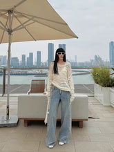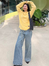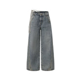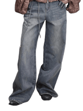 A statement pair of denim jeans designed with a distinctive single-side tie detail and circular loop-tab accents for a modern, fashion-forward edge. Featuring a clean straight-leg silhouette with subtle design detailing, this style balances structure and individuality, elevating classic denim with contemporary flair. Ideal for Autumn styling, it pairs effortlessly with fitted tops, knits, or layered outerwear for a refined yet expressive look.