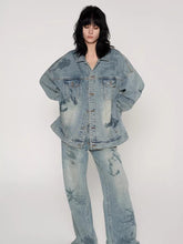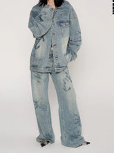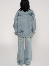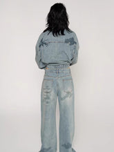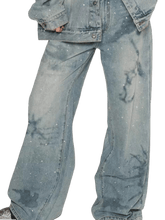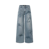 A relaxed straight-leg denim jean designed with a distinctive nautical map motif enhanced by heat-set rhinestone detailing for a subtle yet eye-catching statement. Featuring a clean, loose silhouette with balanced proportions, this style delivers effortless comfort while maintaining a strong fashion presence. Crafted for Spring wear, it pairs seamlessly with graphic tops or matching denim outerwear, making it a versatile staple with elevated detailing.