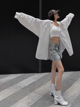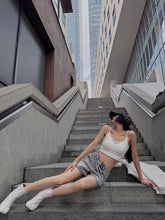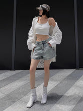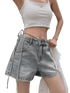 A statement pair of denim shorts designed with an asymmetric waistband and single-side tie detail for a distinctive, fashion-forward look. Finished with raw-edge detailing and a subtle vintage wash, this A-line silhouette offers a relaxed fit that flatters the hips while maintaining a modern edge. Lightweight yet structured, these shorts are ideal for Spring/Summer styling and pair effortlessly with fitted tops, tanks, or loose shirts for an elevated casual outfit.