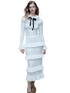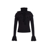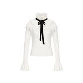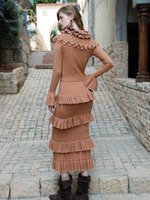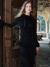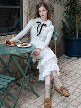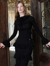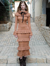 This vintage-inspired two-piece set features a fitted knit top paired with a romantic lace ruffle midi skirt, creating an elegant yet feminine silhouette. The top is designed with a clean neckline and slim fit that softly contours the body, while the skirt showcases delicate lace textures and ruffled detailing for layered visual depth. The coordinated set balances classic romance with modern refinement, making it ideal for day-to-evening styling, dates, or elevated everyday wear.