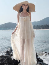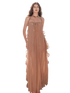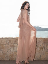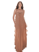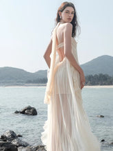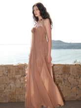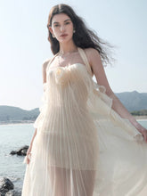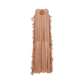This statement maxi dress features a refined halter neckline combined with a strapless, open-back design to create a striking yet elegant silhouette. Crafted with sheer mesh layering, it delivers a soft, atmospheric effect while subtly contouring the body. The fitted bust and waist enhance feminine curves, while the fluid long skirt elongates the figure and adds graceful movement. Designed for evening occasions, special events, or elevated resort styling, this piece balances sensuality with modern sophistication.