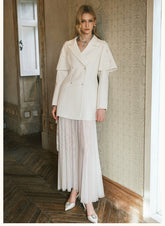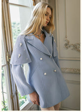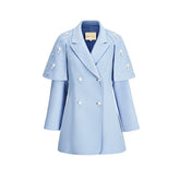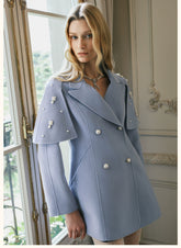 This exquisite wool coat blends vintage-inspired tailoring with modern femininity. Designed in a relaxed silhouette, it features a graceful cape-style shoulder detail adorned with delicate pearl embellishments, evoking an air of timeless refinement. The structured wool-blend fabric ensures warmth and shape, while the loose fit allows for easy layering. A statement piece that balances elegance and practicality—ideal for sophisticated winter dressing.