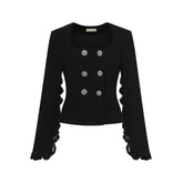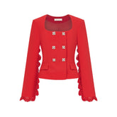 This two-piece ensemble combines vintage charm with refined tailoring. The fitted blazer features a high lace-trimmed collar and sparkling rhinestone embellishments at the waist, creating an elegant hourglass shape. Paired with a matching flared midi skirt, the set exudes timeless femininity and sophistication. Crafted from a structured yet soft fabric, it offers both comfort and a polished silhouette—ideal for formal occasions or elevated everyday wear.