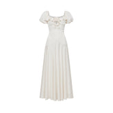 This French-inspired maxi dress features a softly structured square neckline paired with voluminous puff sleeves, creating an elegant yet relaxed resort silhouette. Designed with a subtle tie-dye effect, the dress delivers an atmospheric, vacation-ready aesthetic while maintaining refined femininity. The fitted waist gently defines the figure, flowing into a full-length skirt that elongates the body and enhances movement. Perfect for holiday escapes, summer gatherings, or elevated everyday wear, this piece blends effortless romance with modern charm.