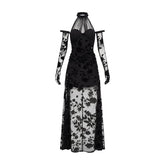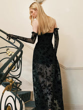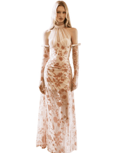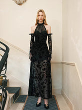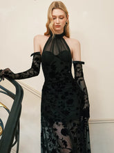 This elegant maxi dress features a refined halter neckline with adjustable tie detailing, paired with a sculpted corset structure that enhances the waist and contours the silhouette. Crafted in soft velvet with dimensional floral accents, it delivers a luxurious texture and romantic depth. The fitted bodice flows into a sleek long skirt, elongating the figure and creating a graceful, feminine profile. Ideal for formal events, evening occasions, or elevated styling, this piece balances sophistication with modern allure.