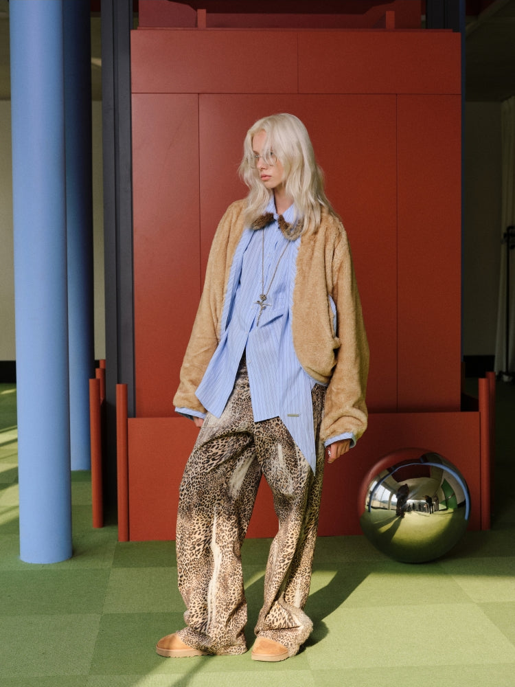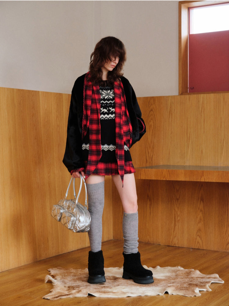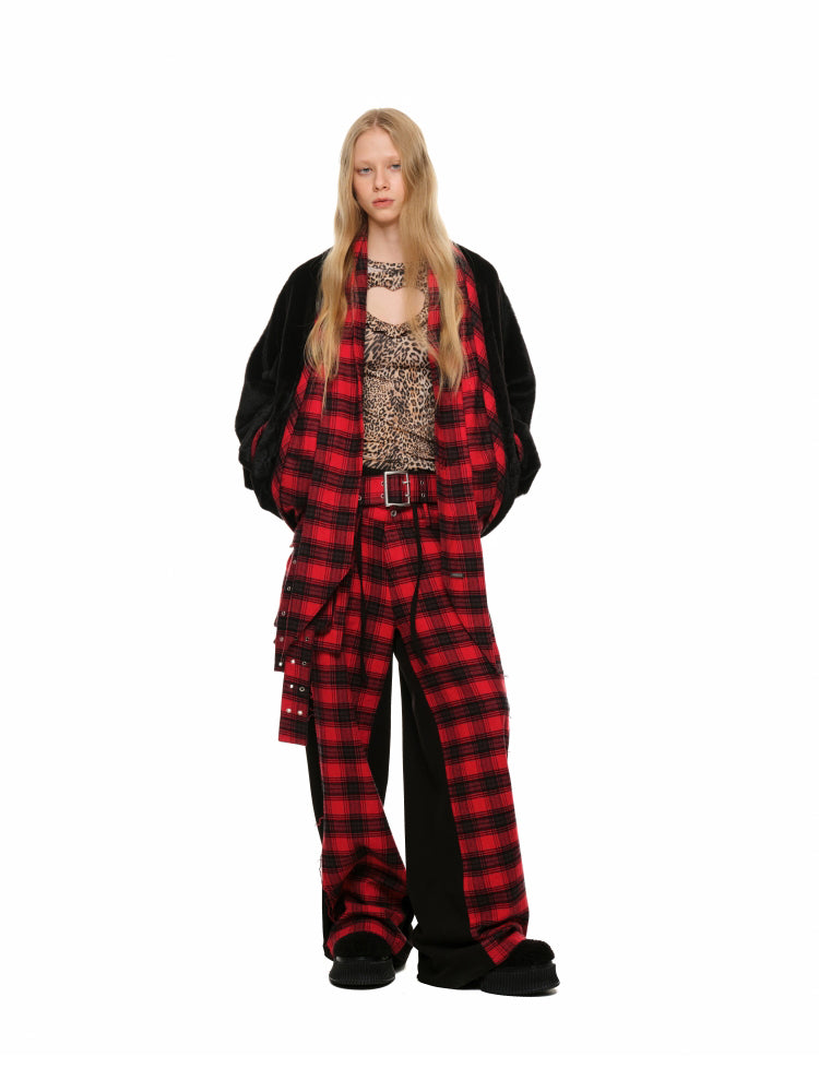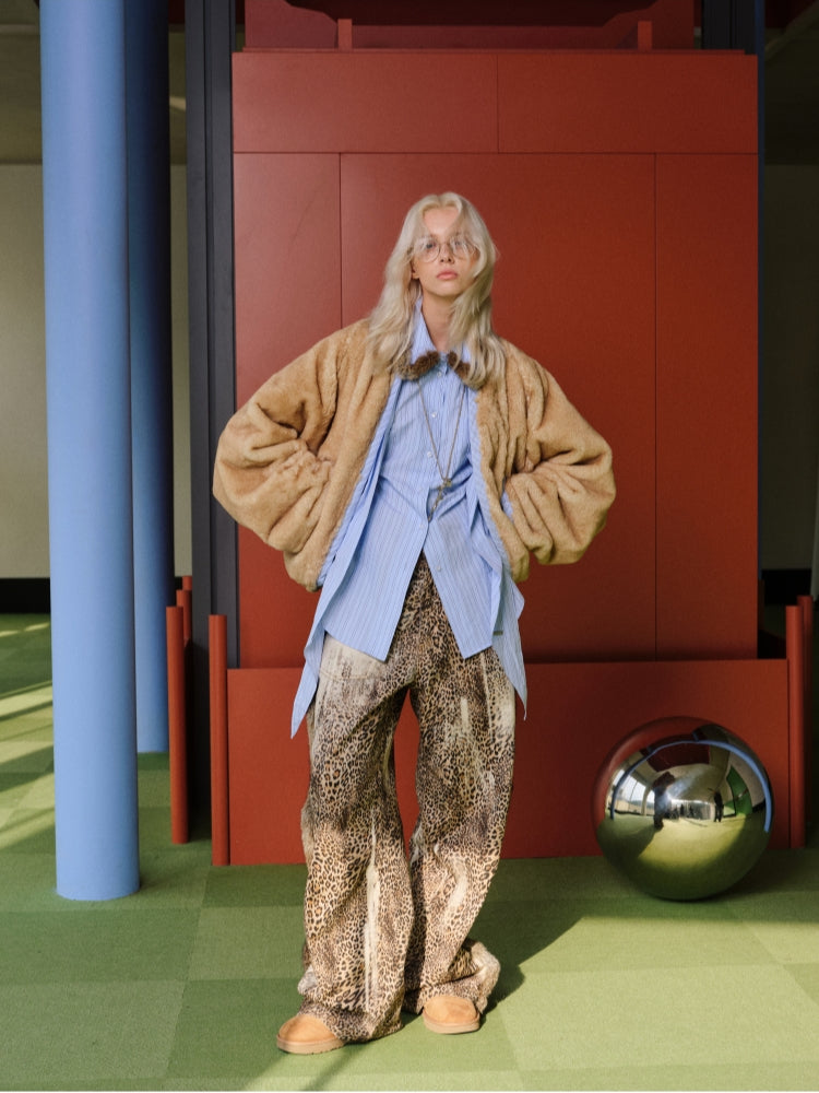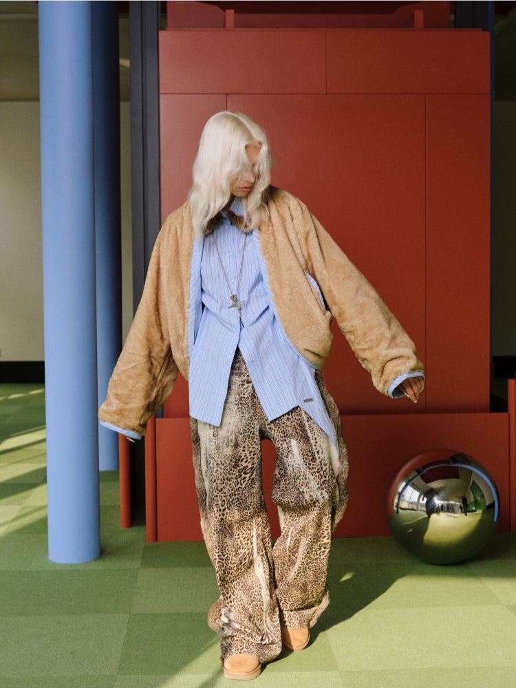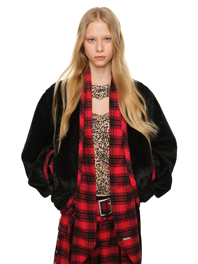 This eco-friendly fur jacket features a color-block design with luxurious rabbit fur accents. The standout feature is its stylish tie detail, adding a touch of flair to this warm and elegant piece. Ideal for layering in cooler weather.