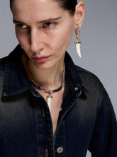 Drawing inspiration from M2M’s design philosophy of “reshaping the philosophy of romance,” this vintage silver fang-and-horn necklace fuses subcultural punk elements with minimalist sophistication. The sculptural tooth and horn motifs evoke raw strength and individuality, while the distressed silver finish adds a touch of nostalgic refinement. Its sleek collarbone-length design enhances modern elegance, offering a bold yet versatile statement piece that complements both casual and elevated looks.