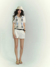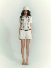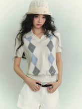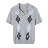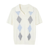 This short-sleeve polo top features a refined diamond panel design with contrast colorblocking, blending vintage inspiration with a modern silhouette. Crafted with a soft knit texture and subtle structure, it offers a polished yet relaxed look. The tailored fit enhances the body shape while maintaining comfort, making it ideal for both casual styling and elevated everyday wear.