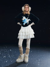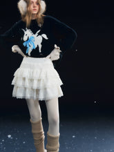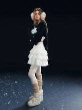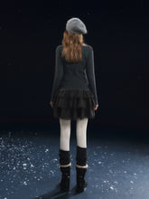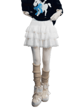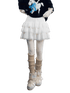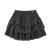 A romantic tiered cake skirt featuring velvety softness contrasted with delicate lace paneling. The voluminous layered silhouette creates a light, airy bounce with each step, offering a feminine and sculptural look. Designed to sit comfortably at the waist, this skirt blends texture and elegance, making it suitable for both daily styling and dressed-up occasions.