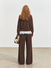 A cozy yet refined loungewear ensemble that balances warmth, texture, and effortless style. The high-neck sweatshirt features a minimalist silhouette with a plush terry-like fleece finish, delivering a soft, delicate hand feel. The matching wide-leg “banana” pants create a relaxed drape with gentle structure, offering both comfort and modern casual appeal. Available in creamy ivory and deep cocoa tones, this set is perfect for both indoor leisure and relaxed outings.