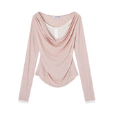 This refined long sleeve top features a faux two-piece construction with a softly draped neckline, creating elegant dimension and fluid movement. The sculpted waist design enhances natural curves, delivering a flattering and feminine silhouette. Tailored with a structured shoulder line and fitted cut, it balances sophistication with everyday versatility. Crafted from soft, stretch-infused fabrics, it offers comfort while maintaining a sleek, polished finish—ideal for both standalone styling and layered looks.
