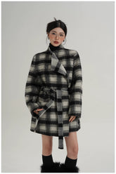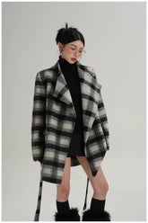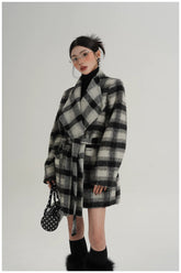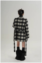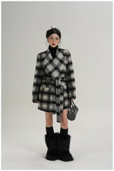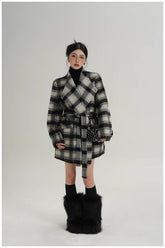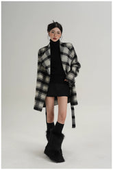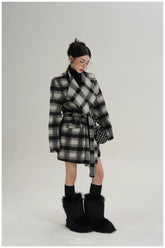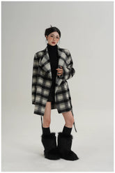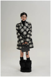 A sophisticated mid-length coat crafted in a timeless checkered pattern, designed with clean tailoring and an elegant silhouette. The double-faced wool construction offers warmth without bulk, making it ideal for autumn and winter layering. Featuring a structured shoulder line, relaxed straight fit, and classic long sleeves, this coat balances modern minimalism with refined femininity. Perfect for both everyday wear and elevated occasions.