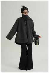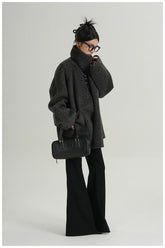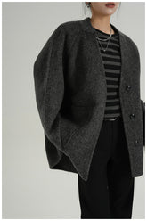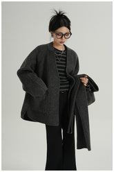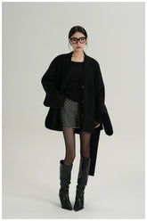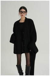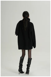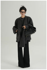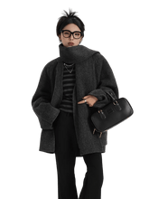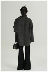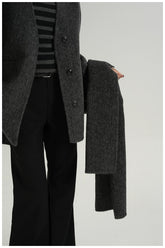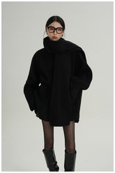 A refined cropped wool coat designed with an integrated scarf detail that adds both warmth and elevated style. Crafted from pure wool, this piece features a relaxed drop-shoulder silhouette with a softly structured drape, creating a modern, effortless look. The shorter length balances proportions perfectly, making it ideal for winter layering while maintaining a polished, high-end aesthetic. A versatile statement piece that transitions seamlessly from everyday wear to elevated city styling.