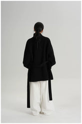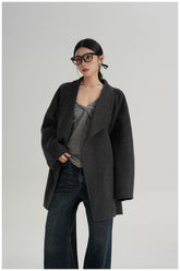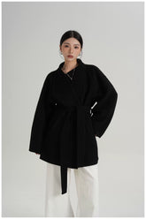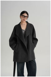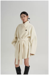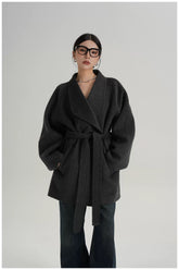 A refined mid-length wool coat designed with a clean tie-belt detail that subtly defines the waist while maintaining a relaxed, elegant silhouette. Crafted in premium double-faced wool, this piece features a soft drape, dropped-shoulder construction, and generous proportions for effortless layering. Timeless and versatile, it delivers a high-end minimalist aesthetic—perfect for autumn and winter styling across both casual and polished looks.