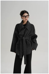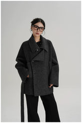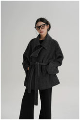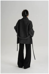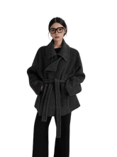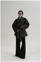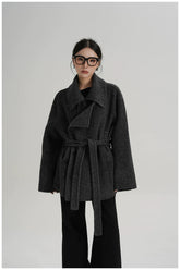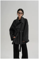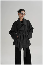 A refined wool jacket featuring an elegant tie-detail and subtle patchwork design that adds depth and modern character to a classic silhouette. Crafted from pure double-faced wool, this piece offers a structured yet relaxed fit with clean lines and balanced proportions. The mid-length cut makes it ideal for autumn and winter layering, delivering a sophisticated, minimalist aesthetic that transitions seamlessly between everyday wear and elevated styling.