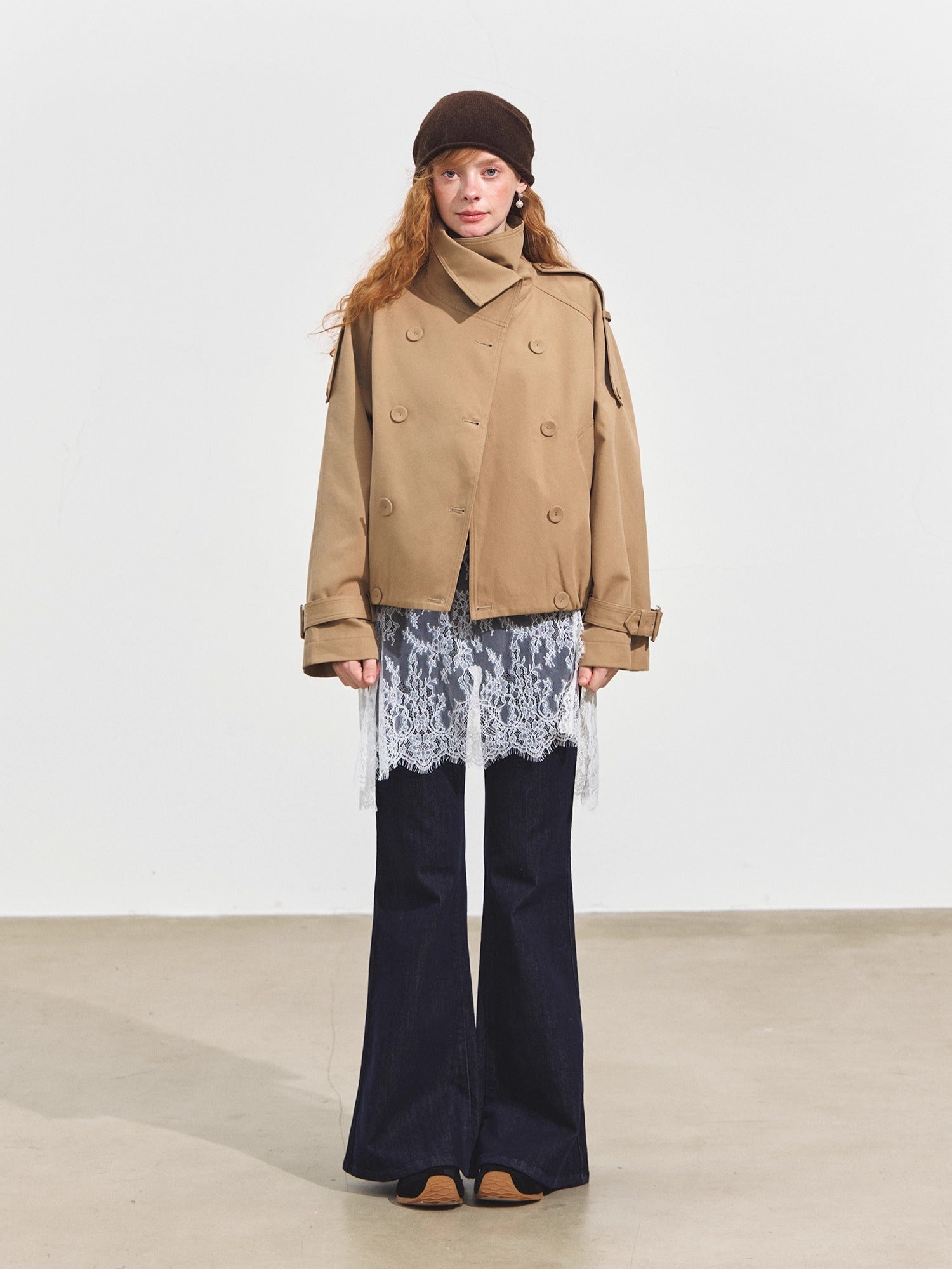 A chic cropped trench coat featuring an asymmetrical stand collar and double-breasted design. Tailored for a structured silhouette with a modern touch, perfect for transitional weather styling.