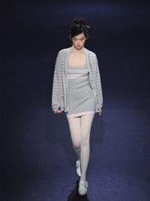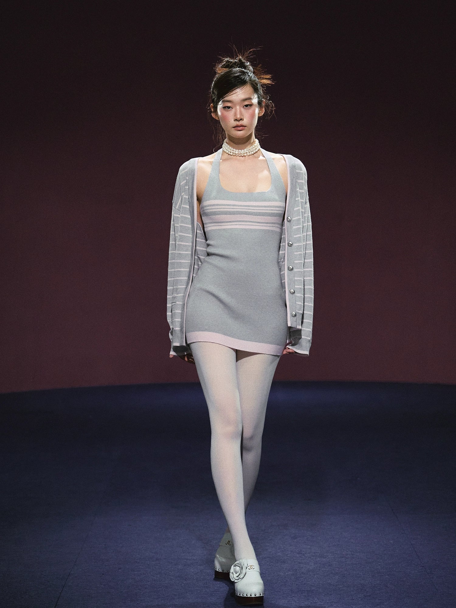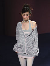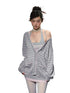 A stylish striped contrast V-neck one-shoulder knit cardigan, paired with a matching dress. Detailed size charts for both the top and the dress are available.